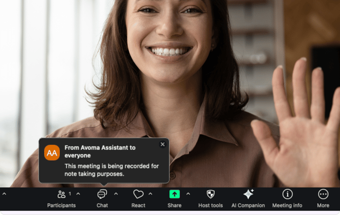 Chat notifications: The Avoma Bot automatically posts a recording disclaimer in the conferencing app's chat the moment the session begins.