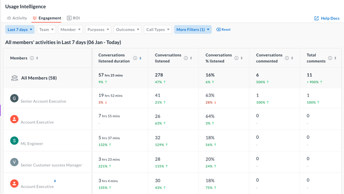 - Use Conversations % listened to compare engagement fairly across roles and workloads.